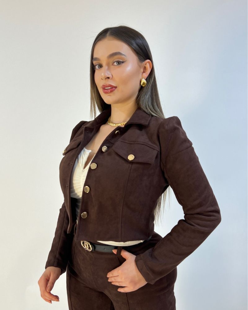 Cuenta con botones metálicos dorados que destacan sobre el fondo chocolate, bolsillos de tapa decorativos y un corte entallado que define tu figura. Ideal para elevar cualquier outfit, desde looks formales hasta combinaciones más relajadas.